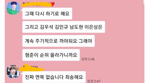 저거 프갤에서 톡 주작한거래 방금 들었는데 사진으로 프사 해두면 프사 밑에 네모로 이렇게 떠 저번에는 요한이 톡으로 주작하더니 난 그냥 갤 안 믿을래...
