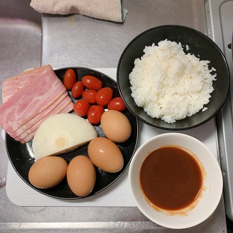 재료 : 베이컨, 계란, 양파, 미니 토마토, 밥, 좋아하는 소스, 스파이스 소금, 소금, 후추, 토핑야채