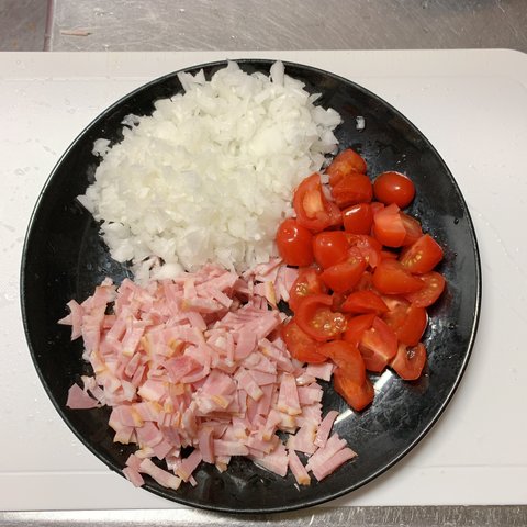 양파, 베이컨, 미니토마토를 잘게 다지고 자른다.
