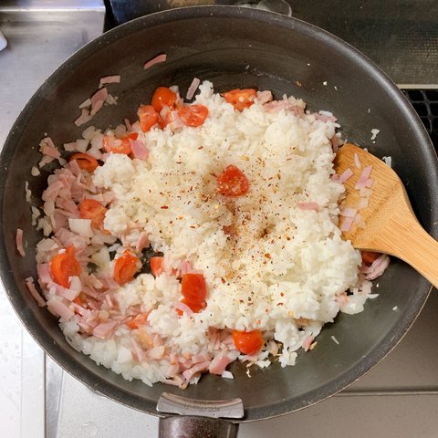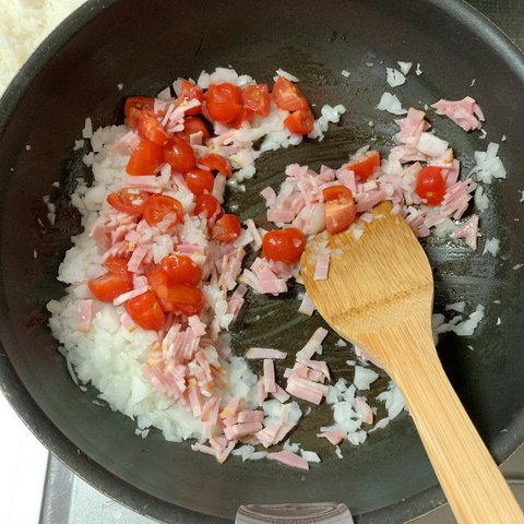 양파가 투명해지면 미니 토마토, 베이컨을 넣어 볶아준다.