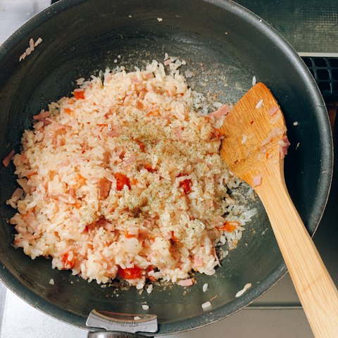 토마토가 일그러 지면 먹을 만큼의 밥에 스파이스 소금과 소금을 좀 더 해주고 간을 맞춘다.