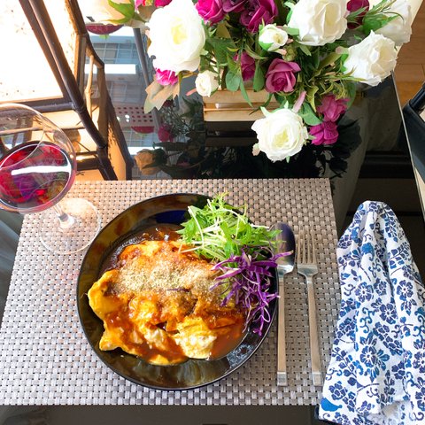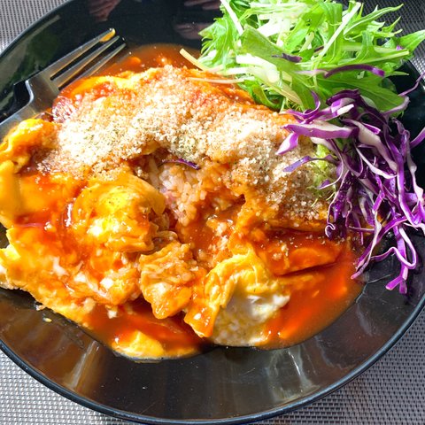 만들어 놓은 오므라이스 소스( 케찹, 오이스타 소스, 매실청 또는 설탕)또는 데미그라스 소스에 좋아하는 치즈 파우더, 드라이 허브 파우더, 야채로 마무리한다.