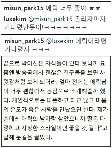 박미선님이 30년 넘게 연예계 생활에서 별꼴을 다 보고 이상한 연예인들 많이 보셨을텐데 본인 딸 소개시켜주고 사윗감 삼고 싶었다는것만 봐도 딱 보이잖아... 웬만해선 딸 소개시켜주고 싶단 소리 안나옴.. 아무리 괜찮아도..ㅋㅋ 이휘재도 진짜ㅋㅋㅋㅋ 너무 웃겨.. 오죽 이뻤으면 저 까칠한 인간이 본인 아들 같다고 앜ㅋㅋㅋ