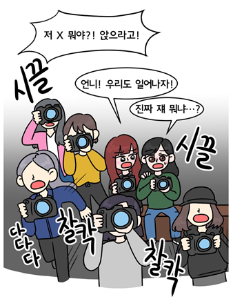 닥. 사진 찍고, 행사 찾아가는 것까지는 좋은데, 특히 공항 이런데서 민폐야, 연예인 입장에서도 일정이 있는데, 너무 무대뽀로 그렇게 굴면 진짜 서로 피보는 거임...이게 어느 순간에 경쟁 비슷하게 돼서, 누가 더 많이 좋은 사진 영상을 건지고,누가 더 좋은 홈인지 경쟁하듯이 그래서 그런건지는 모르겠지만.... 어쨌든 핵심이 팬심에서 조금은 멀어진 느낌이랄까....