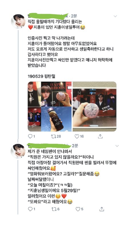 자기 생일날 직접 가서 셀카로 인증까지 해준거도 좋은데 거기서 자기 팬도 만남ㅋㅋㅋㅋ심지어 박지훈이 직원한테 직접 팬 빌려와서 해준 싸인인거 ㄹㅇ개부러워...