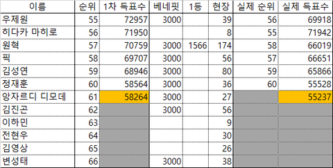61등 앙자르디 디모데 득표 수의 경우 약 300표 정도로 차이가 난다고 해서