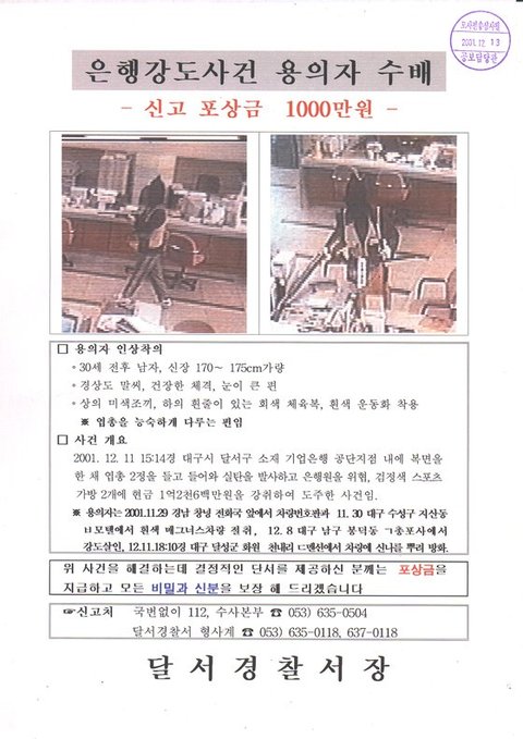 2차 - 기업은행 대구 성서공단지점 강도 1억2000만원 탈취 도주