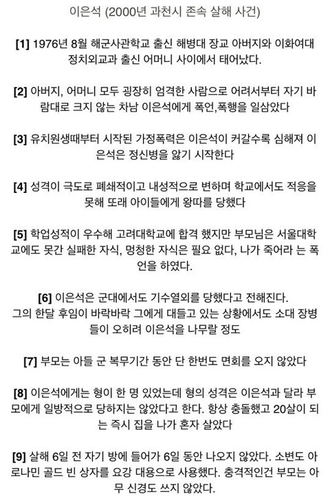 이은석의 형이 법정에서 한 말 중에 '우리의 부모가 회사 상사가 직원 부하에게 주는 그정도 관심만큼이라도 주었으면 이렇게 되지는 않았을 것이다'가 있는데 이 말을 듣고 재판장 안이 눈물바다가 되었다고...