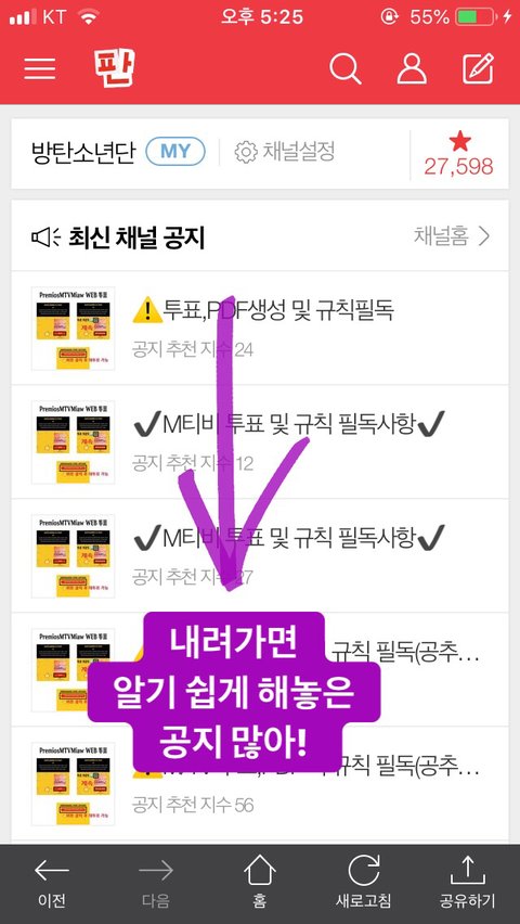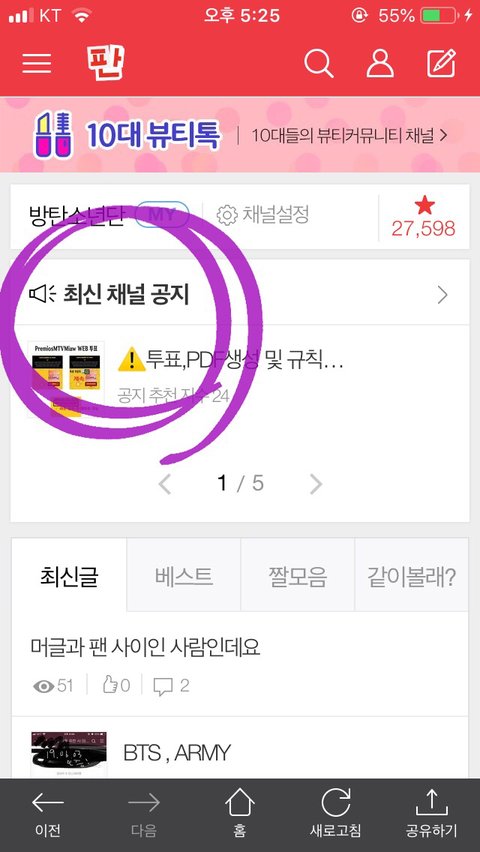 방탄소년단 팬톡 들어오면 맨 위에 저기!!! 표시해놓은 곳에 들어가!! 최신채널공지!!!! 화살표!!!!