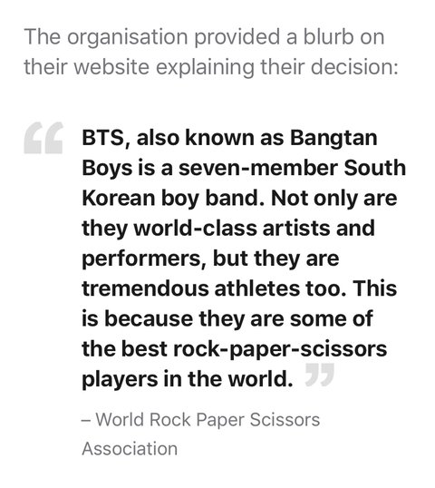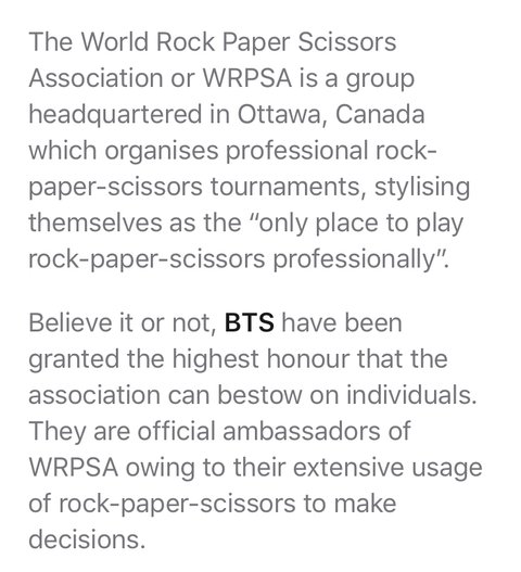 BTS는 놀랍게도 세계기록 가위바위보 협회의 공식 대사입니다. "그들은 세계 최고의 가위바위보 선수들입니다" World Rock Paper Scissors Association(WRPSA)는 캐나다의 오타와에 본사를두고 전문 가위바위보 토너먼트를 조직하고 "전문적으로 가위바위보를 시합을 하는 유일한 장소"로 자리 매김하는 단체입니다. 믿거나 말거나, BTS는 협회가 개인에게 수여 할 수있는 최고의 영예를 부여했습니다. 그들은 결정을 내리기 위해 가위바위보를 광범위하게 사용하기 때문에 WRPSA의 공식 대사입니다. 이 단체는 자신들의 웹 사이트에 이러한 결정을 설명하는 메시지를 제공했습니다. Bangtan Boys라고도 알려진 BTS는 7명으로 구성된 한국인 소년 밴드입니다. 그들은 세계적 수준의 예술가와 공연가일뿐만 아니라 엄청난 운동 선수이기도합니다. 이것은 그들이 세계에서 가장 훌륭한 가위바위보 선수이기 때문입니다
