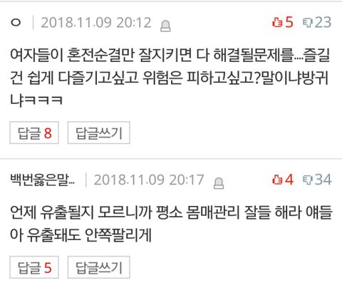 판보다가 경악했네요. 커플 몰카,리벤지포르노 영상이 너무 공포스럽다는 글에 달린 댓글인데 이게 사람 머리속에서 나올만한 생각인지... 앞으론 멀쩡한척 얘기하면서도 뒤로는 저런생각을 가진 사람들이 얼마나 많을지 생각하면 소름이 끼칩니다. 딸이 열두살인데 어떻게 키워야할지 인터넷을 하다보면 참 막막하면서도 슬프네요