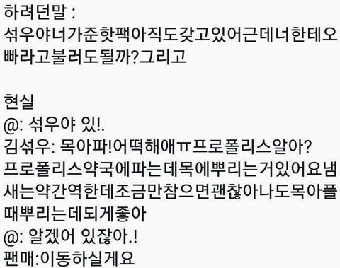 말 겁나 많긴한데 수줍음 많고 잘생긴 사람 앞에서 서면 긴장 많이하는 팬들(=나)은 내가수가 내 앞에서 본인TMI뿌리고 본인 얘기 마구마구 해주고 질문도 해주면 너무 좋을 것 같애ㅋㅋㅋㅋㅋㅋㅋ