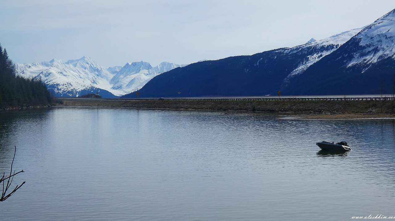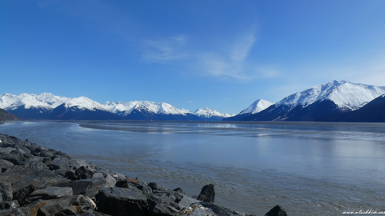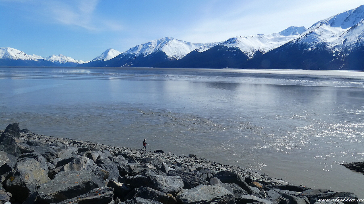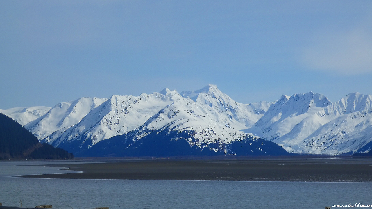물이 빠진 갯벌과 설산 8자 병풍입니다.