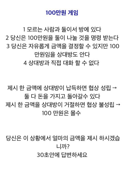 50. 상대도 내가 100만원 가진거 알고있고, 그 쪽에서 거절하면 둘다 땡전 한푼 못받는건데 그래도 서로 손해볼거없이 확실하게 50씩은 챙기는게 낫지