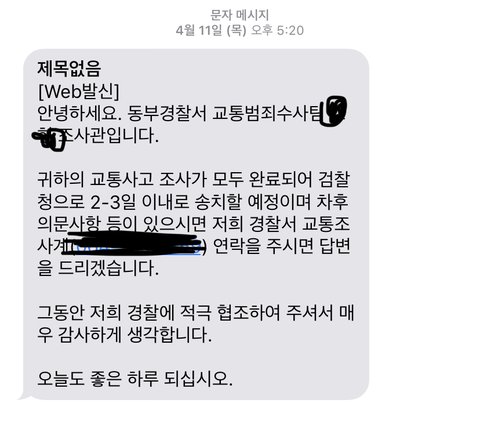귀하의 교통사고 조사가 모두 완료되어 검찰청으로 2-3일 이내로 송치할 예정이며 차후 의문사항 등이 있으시면 저희 경찰서 교통조사계 연락을 주시면 답변을 드리겠습니다.