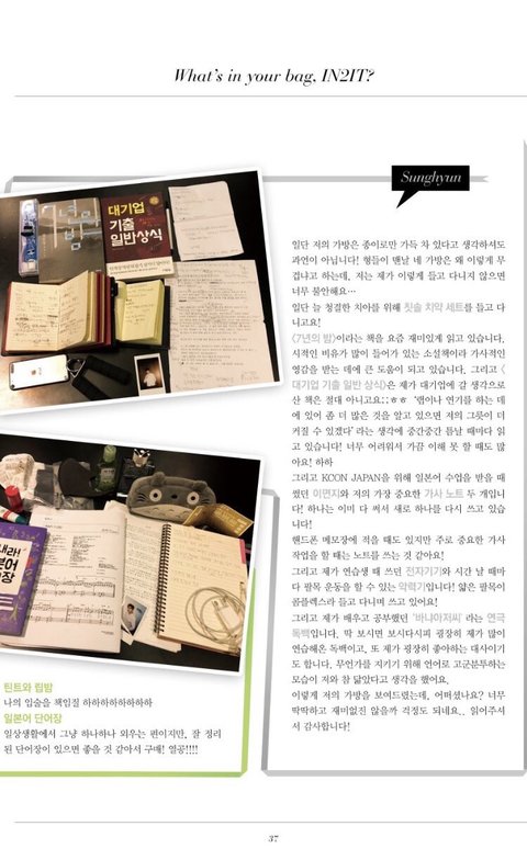 다음은 성현이 가방 속인데 가방 안에 들어있는 것들이 다 가사 쓰기 위해 아니면 아이돌 생활 더 잘하기 위해 들어 있어 노트와 종이를 빼곡하게 채운 글씨들 보이지? 성현이는 시 쓰는 걸도 좋아하고 래퍼라 가사도 써서 늘 노트를 가지고 다닌대 여기서도 얼마나 성실한지, 노력파인지 알 수 있을거야