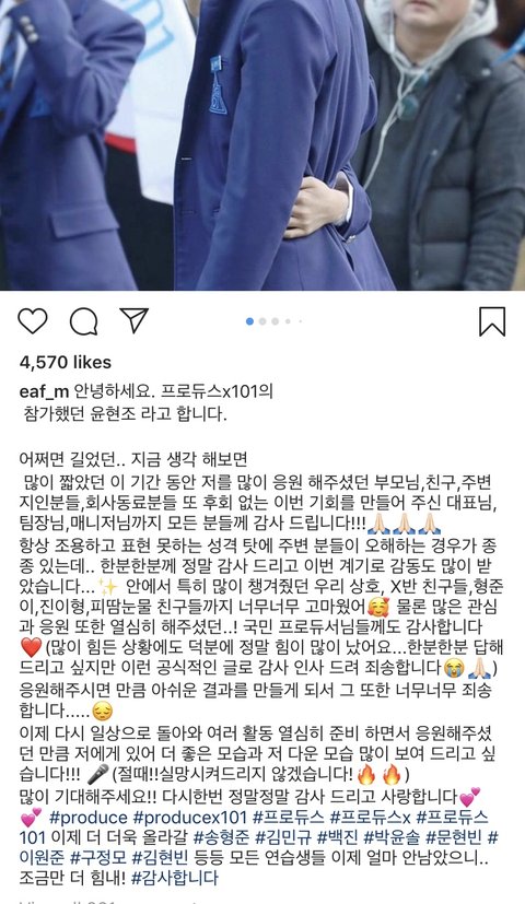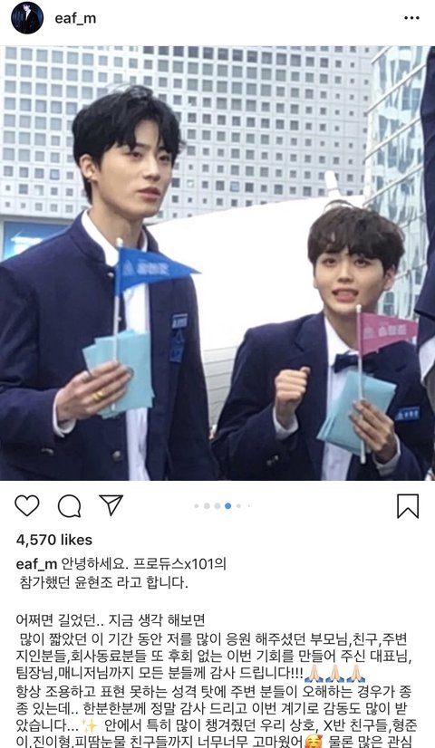 탈락한 윤현조 연습생이 응원글 올렸는데 그중에 한명이 송형준이고 송형준 사진 두개나 올렸음