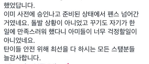 위험해보엿는데 다 시큐 사전합의된거라니 다행이지ㅠㅠ 이일로 형들한테 혼났겠네, 아무리그래도 돌발행동이라 위험햇다 등 은근 꾹이 행동 나무라는 사람들 있어서 속상했는데ㅜㅜ