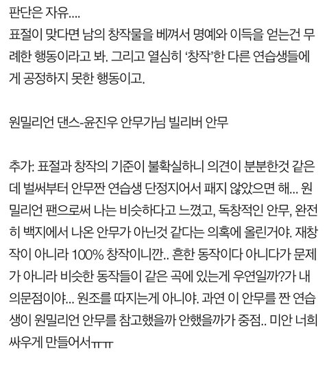 판 둘러보다가 빌리버 안무 표절의혹이라는 글보고 엄청 깜짝 놀라서 들어갔거든? 근데 솔직히 너무 어이가 없어거지고 해명글 들고 왔어.