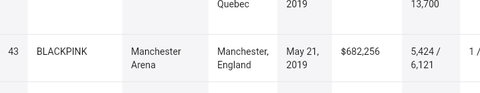 이글보고 궁금해져서 빌보드 박스스코어 가봤는데 박스스코어 떴네 ㅋㅋㅋㅋ근데 매진된게 없는데? 심지어 맨체스터 아레나 뭐임 2만석짜리를 6천석 빌려놓고 그것마저 노매진인데;;