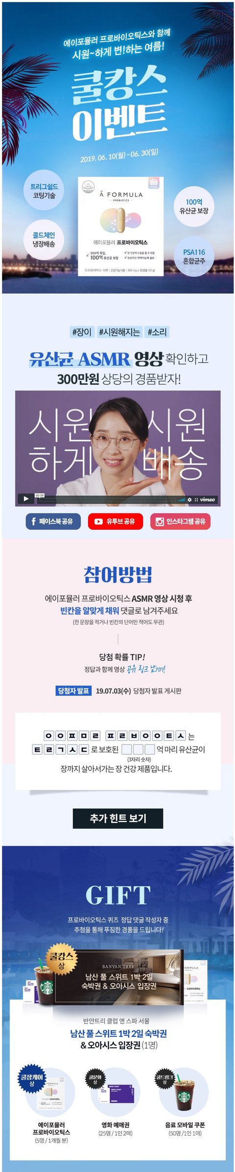 남산 풀 스위트 1박 2일 숙박권 (1명) 프로바이오틱스 본품 (5명) 영화예매권 (25명) 스타벅스 아메리카노 (50명)