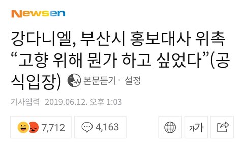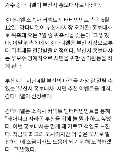 새로운 부산시 홍보대사 강다니엘 무보수 명예직이래! 부산 시민들이 투표해서 직접 선정한 홍보대사임 부산 사는 강다니엘 팬인데 너무 좋다,,, 이제 사직야구장에서 시구도 하자ㅠㅜㅜ