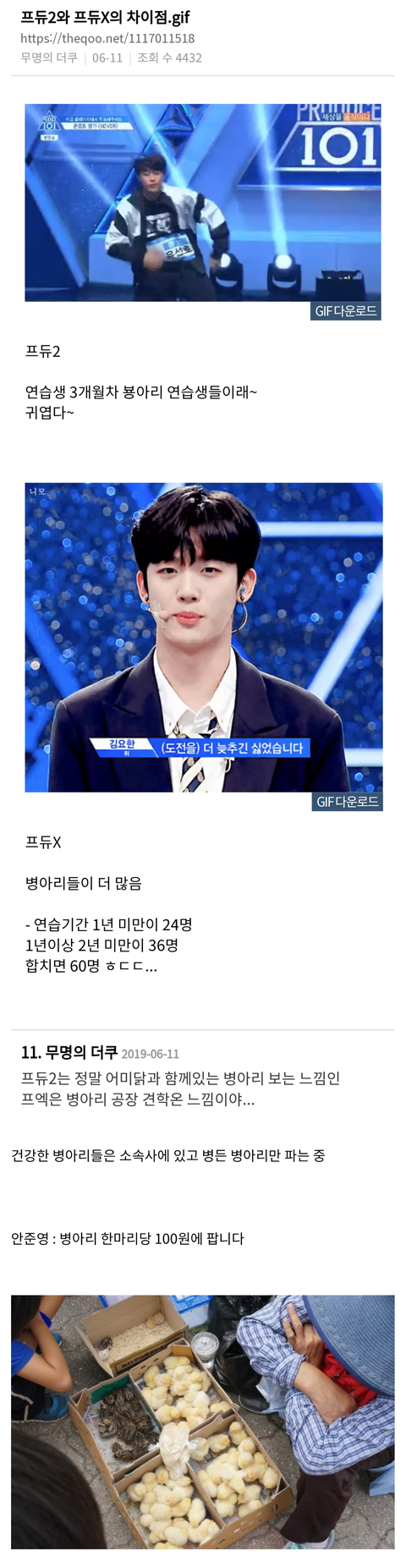 표현 죽인다니..아무리 그래도 연습생들을 병든 병아리에 비유하는데