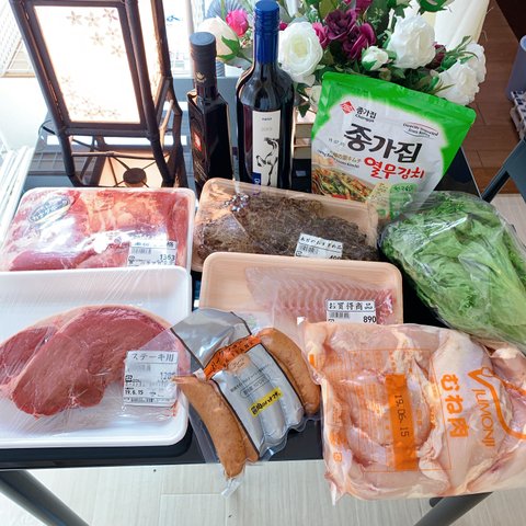 한달가량 먹을 삼겹살, 닭고기.. 그리고 금방 먹어치워야 할 것들. 한화 약 8만원정도.
