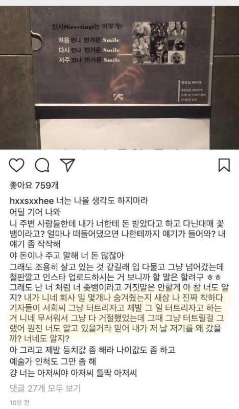 솔직히 지금은 한서희 응원함... 예전에는 별로였는데 양현석 때문에 관종이미지를 스스로 만든 것 같음... 그리고 저 사진도 보면 일부러 날짜 나오게 했는데 그게 비아이 마약하고 양싸랑 대화 나눈날인거임..