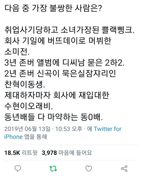 ㅈㄹ하고 자빠졌다...버닝썬 피해자들 승리 몰카 피해자들이 불쌍하지 지금껏 와이지 후광받고 드러운 돈으로 언플해서 띄운 애들이 불쌍 ㅇㅈㄹ 네다약 그리고 트윗초보냐? 알티수높다고 그게 다 공감해서 하는 알티인게 아님 욕하고 비웃으려고 알티하는 경우가 더 많아ㅋㅋㅋ실제로 저거 욕만먹고있던데 와이지빠는것들은 왜이리 눈치가 없냐?