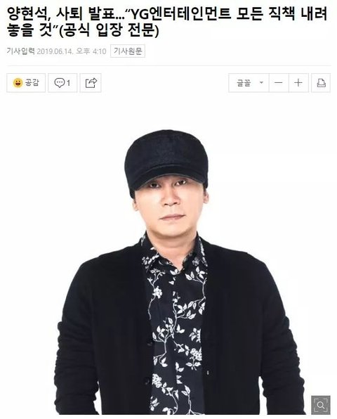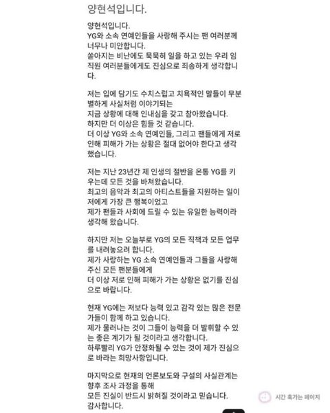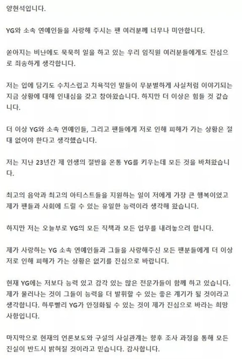 결국 양현석은 YG대표직에 내려오기로 결정을 했다.