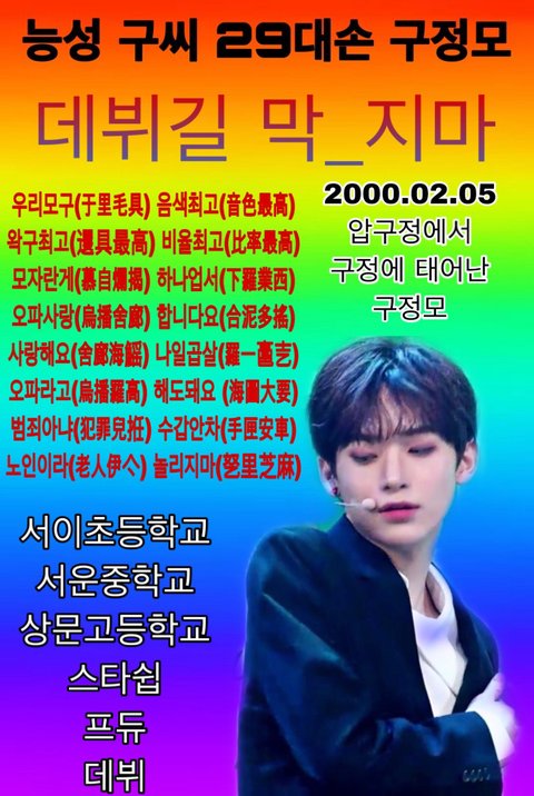 뜬금없는 마무리지만 여기까지입니다... 선생님들 가능하시면 구정모 투표 부탁합니다 굽신굽신... 부탁드립니다... 선생님들네 예쁜 연습생들 옆에 쪼금 낑겨 주십시오...... 지금 무릎 꿇고 조아리는 중