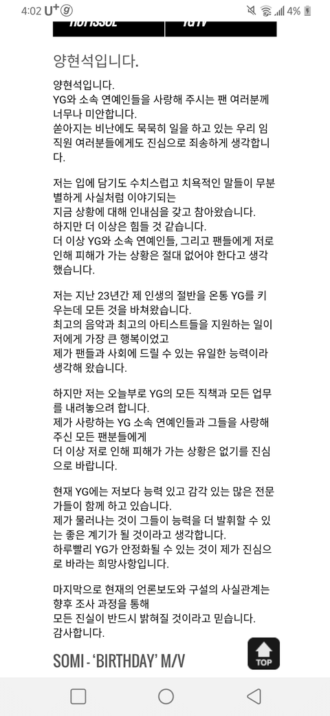 하지만 저는 오늘부러 YG의 모든 직책과 모든 업무를 내려놓으려 합니다.