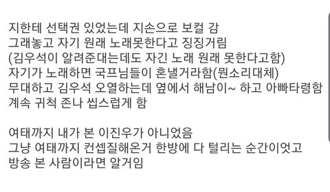 김우석은 순위 안정권이니까 그 상황에서도 화 안내고 노래 가르쳐준다며 이미지 관리할 여유가 있었던거지. 다들 언제 탈락할지 모르는 다급한 상황이었으면 분위기 개싸하고 팀 분열나고 카메라만 없으면 욕도 했을듯