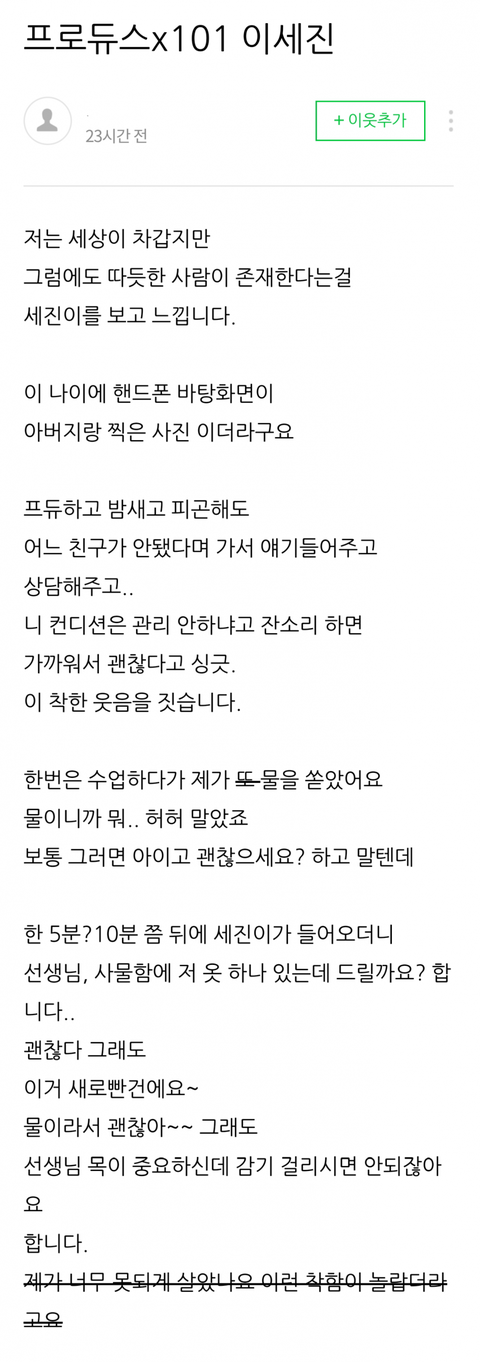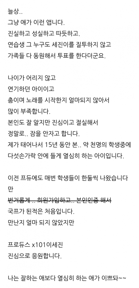 트레이넘 쌤이라면 지금까지 많은 친구들을 봤을텐데 그럼에도 불구하고 노력과 열정을 인정받은 이세진 연습생께 여러분 한표 부탁합니다♥