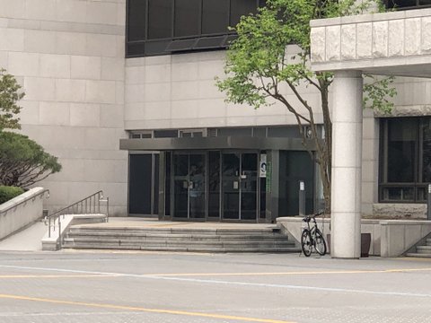 그리고 다음날인 6월 14일(금) (AM 08:10)평소와같이 아침시위를 갔고 집회신고한 자리에서 경찰관의 지휘하에 사과즙을 까먹으며 도란도란 이야기 나누는 도중 신청했던 정보공개요청서류가 발급되었다고 문자를 받은 민원인이 있어 두 분이 그 자료를 받으러 들어가려고 시청으로 향했고, 충주시청 출입문이 전부 막혀있고 시청 커피숍 보건소쪽과 민원실쪽 모두 잠궈놓고 인원을 배치해둔 상태였던거다(사진)