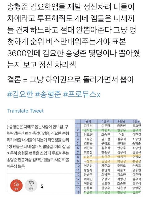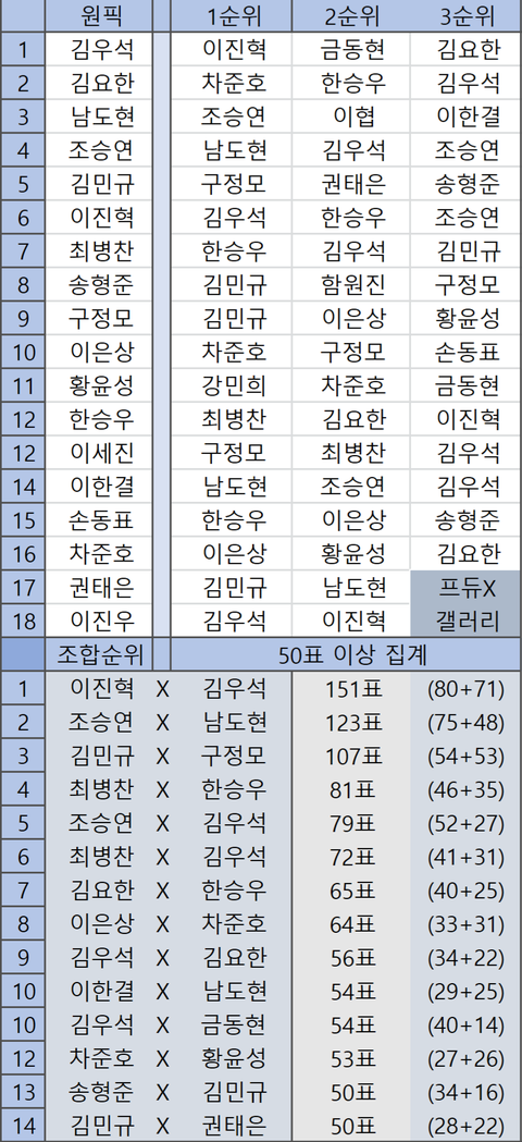 견제때문인지 김요한 송형준은 차애로 뽑는사람이 안보임..구정모 차애들에도 송형준 없는건 ㄹㅇ 충격이였음; 김요한 송형준 원픽들은 정신 차리기 바람 너네들이 하는거 타연생들 순위 높이는짓이고 다른연생 팬들은 너네 절대 안뽑을걸..머리 잘 굴리고 투픽해야함 ㅇㅇ 특히 송형준 팬들은 스쉽 다 투표해주는데 막상 다른애들은 송형준 안뽑아줌 김요한 팬들도 차준호 뽑는데 차준호 팬들은 이은상 뽑음..그나마 송형준 뽑아주는건 김민규 팬들인데 그것조차 3순위임