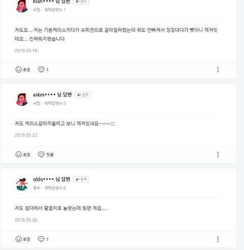 어떻게 케이스를 끼우다가 금이가나요? 여자힘으로 엄청쎄게 다룬것도아니고