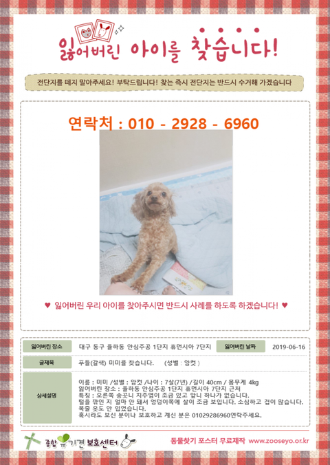푸들(갈색) 이름 : 미미 / 성별 : 암컷 / 길이 40cm / 몸무게 : 4~5kg잃어버린 장소 대구광역시 동구 율하동 안심주공 1단지 ~ 휴먼시아 7단지 근처특징 : 오른쪽 송곳니에 치주염으로 인한 잇몸에 구멍. 앞니 하나가 없습니다.털을 깎인 지 얼마 안 돼서 엉덩이쪽에 살이 조금 보입니다. 가슴부근 젖꼭지개수가 짝짝이 입니다. 성격은 소심하고 겁이 많아서 사람이나 동물을 기피합니다. 목줄 옷도 안 입었습니다. 혹시라도 보신 분이나 지금 보호하고 계신 분은 01029286960연락주세요.