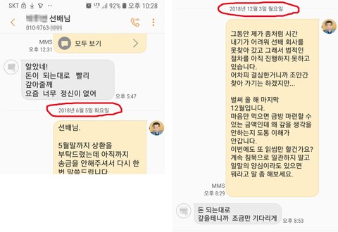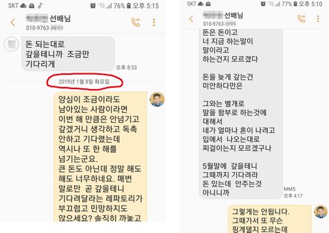 지금 6월 중순이 지났는데 올해 초 문자에서 5월말까지 갚겠다고 약속해 놓고 아무렇지도 않게 또 거짓말을 하는 P선배의 이런 진정성 없는 태도에 앞으로 제가 어떻게 대응하는 것이 옳은지 많은 분들의 고귀한 조언을 부탁드려 봅니다.