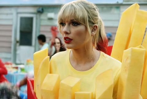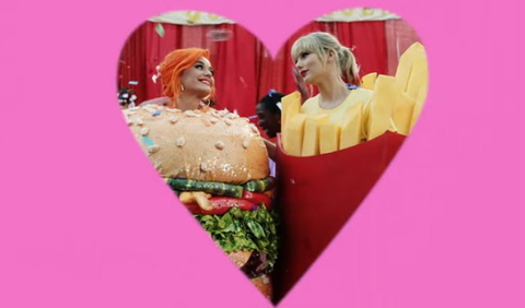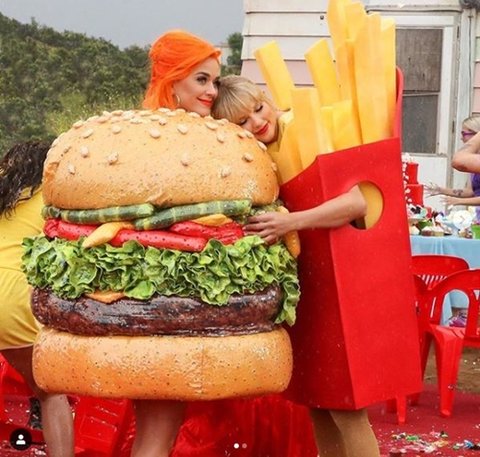 햄버거 분장을 한 자신과 포테이토 분장을 한 테일러 스위프트와