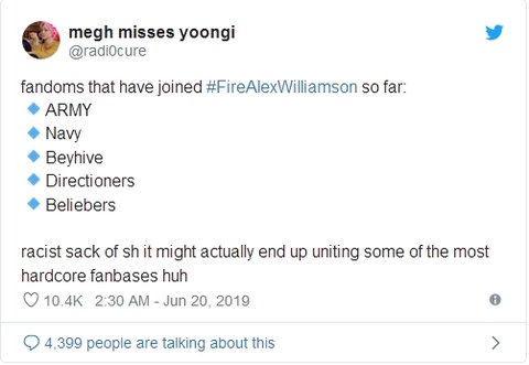 This morning, we woke to find that the fanbases of One Direction, Beyonce, Justin Bieber and BTS want comedian Alex Williamson’s head on a pike.