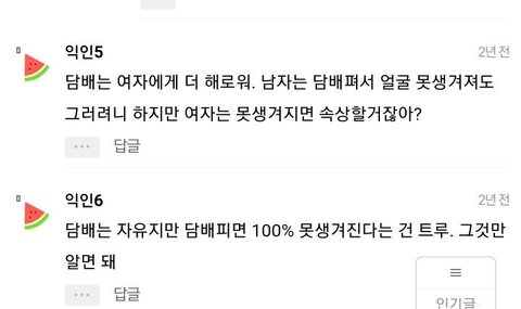 담배는 여자에게 더 해로워. 남자는 담배쳐서 얼굴 못생겨쟈도 그려려니 하지만 여자는 못생겨지면 속상해할거잖아?