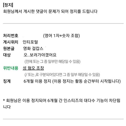오.. 걸캅스 보러가야겠네요: 성 혐오 조장으로 6개월 정지 (갈캅스 때문에 강퇴당한 사람 오조오억)