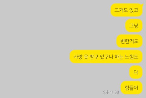 아 참 사진은 내가 너랑 헤어지기 한시간 전인가 그때 친구한테 말했던건데 저거 보니까 내가 얼마나 힘들었었는지 기억나서 씁쓸하네