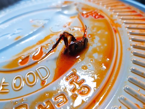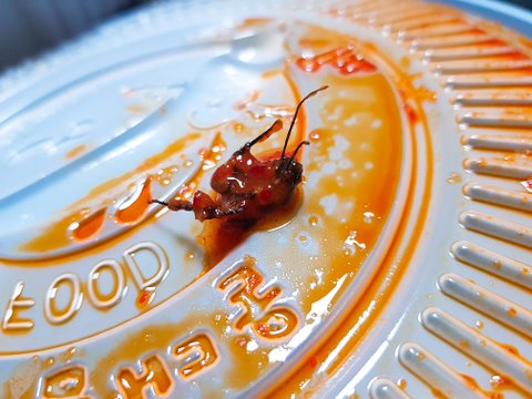 - 먹는 도중 대략 저녁 9시 경 엽떡의 1/3을 먹은 시점에서 이상한 검은색 물체를 발견했습니다. 평소 엽떡을 자주 먹는 사람으로서 '엽떡 재료 중 이런게 있었나?' 하고 건져보니까 바퀴벌레 반쪽이었습니다. 그 반쪽의 바퀴벌레는 양념 사이에 있었습니다.