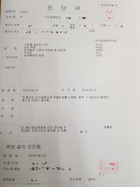 - 바퀴벌레 그것도 반쪽이 나왔기에 먹었을 수도 있었을거란 충격에 그날 이래로 지금까지도 구토 증세가 이어지고 있습니다. 특히나 당일 매운 음식을 토하다보니 위와 식도가 많이 상했다고 합니다. 회사 근무가 있었지만 계속 토하고 속이 쓰리니 일은 커녕 버티는것조차 힘들어 오후에 조퇴하고 회사근처 내과를 찾았습니다. 검사 결과 위염을 진단받고, 계속 토하는 걸 막기 위해 구토억제 주사와 관련 약을 처방받아 복용 중입니다.