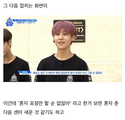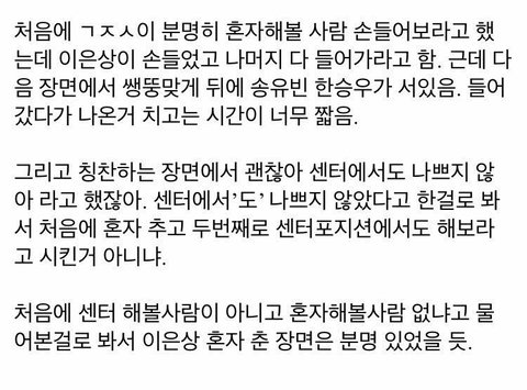 사진이랑 똑같아 처음에 ㄱㅈㅅ이 혼자 춰볼 사람? 해서 이은상이 손을 든거고 짜집기 의혹 된 부분에서 다른 연생들 나와 있고 센터에서'도' 나쁘지 않아였어