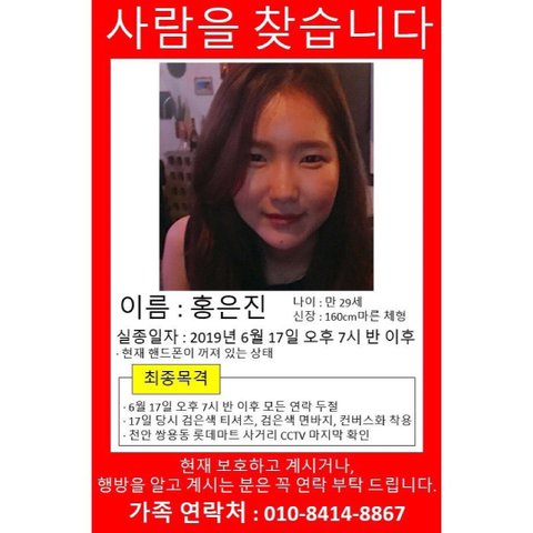 지난주 17일, 제 사촌동생 홍은진양이 사라졌습니다. 공무원 준비중이였고 시험을 본것밖에 사라지기전에 특별한 사건은 없었습니다.