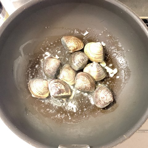 버터에 마늘 다진것을 볶고 조개를 넣고